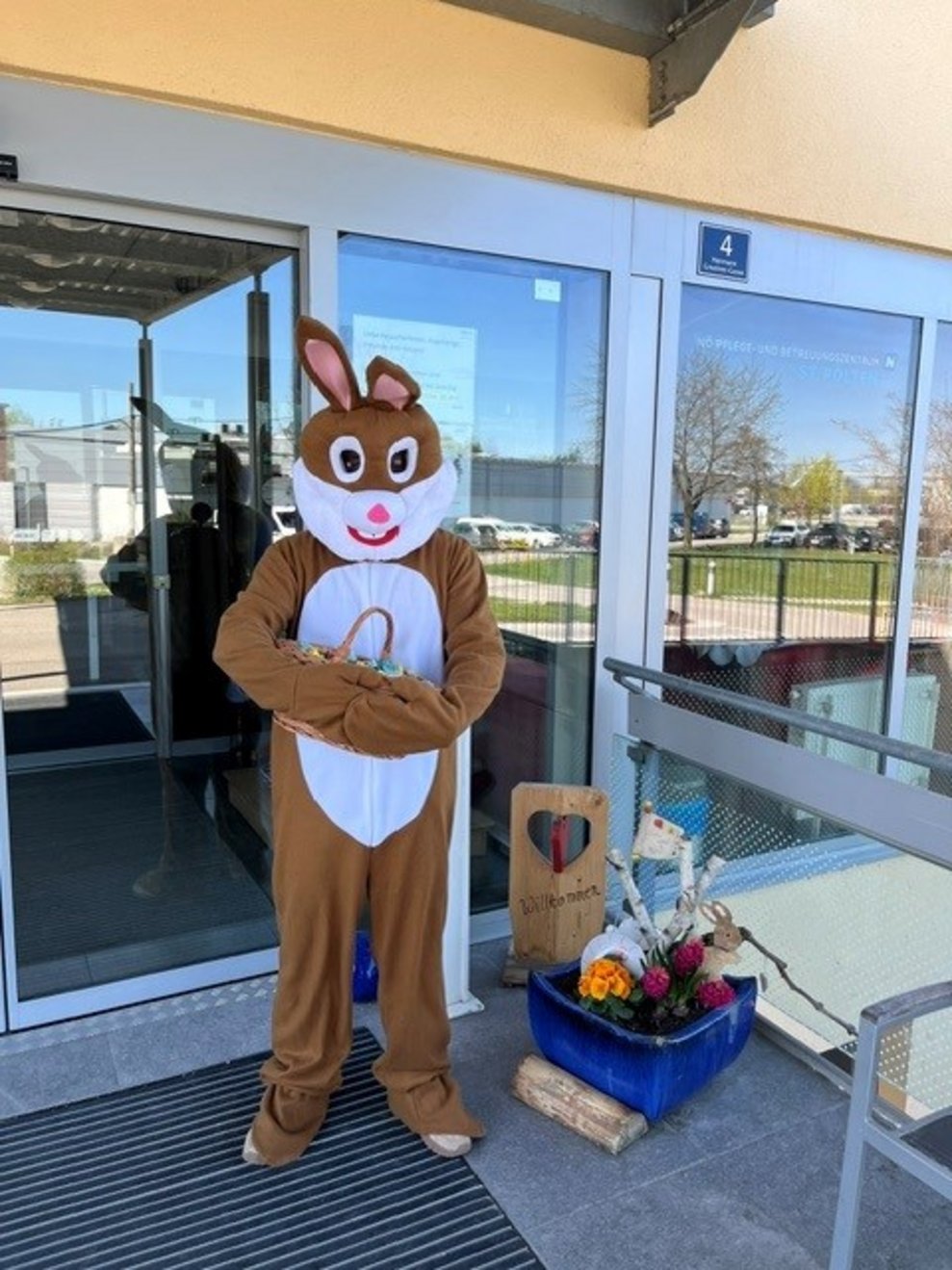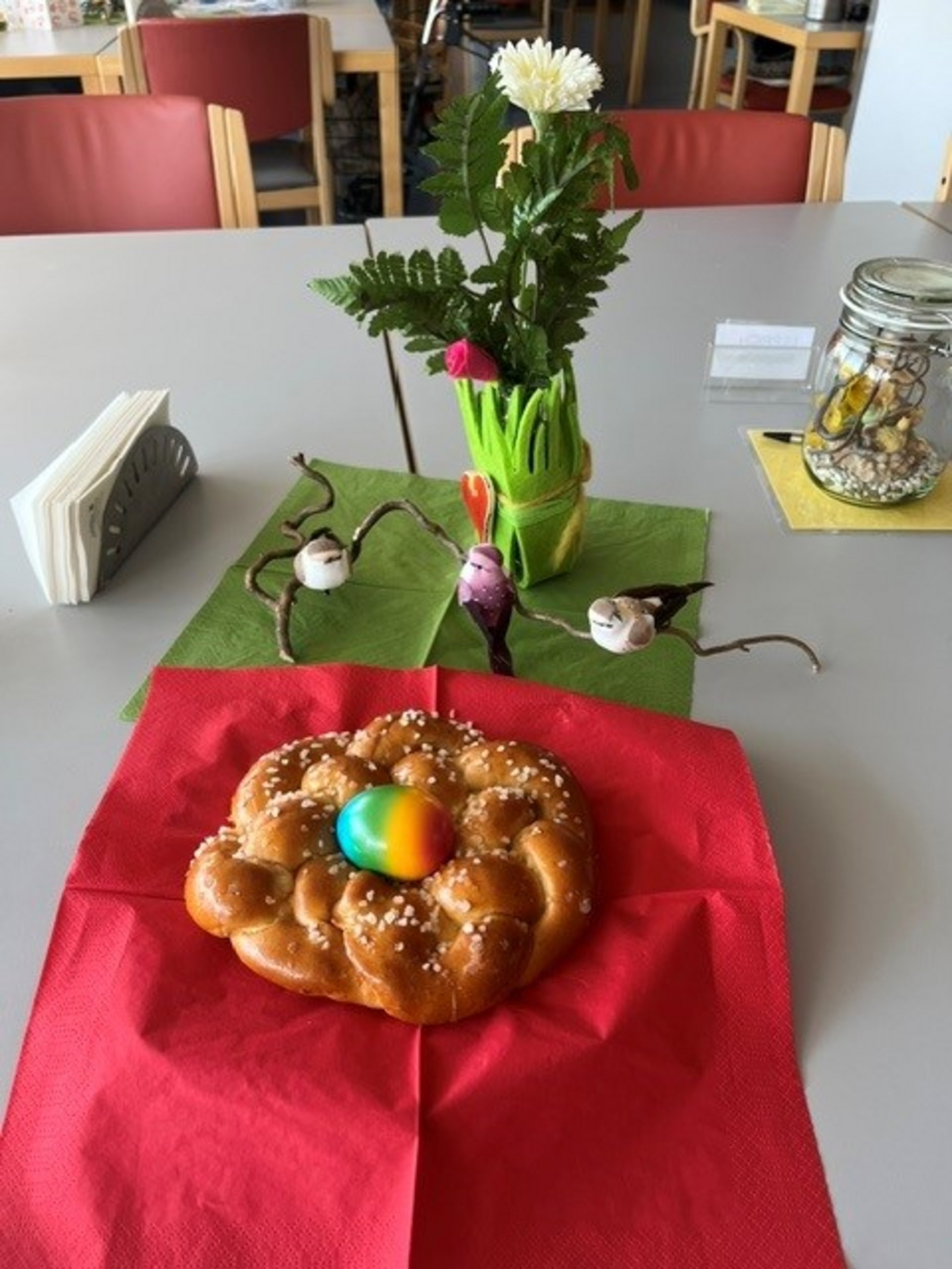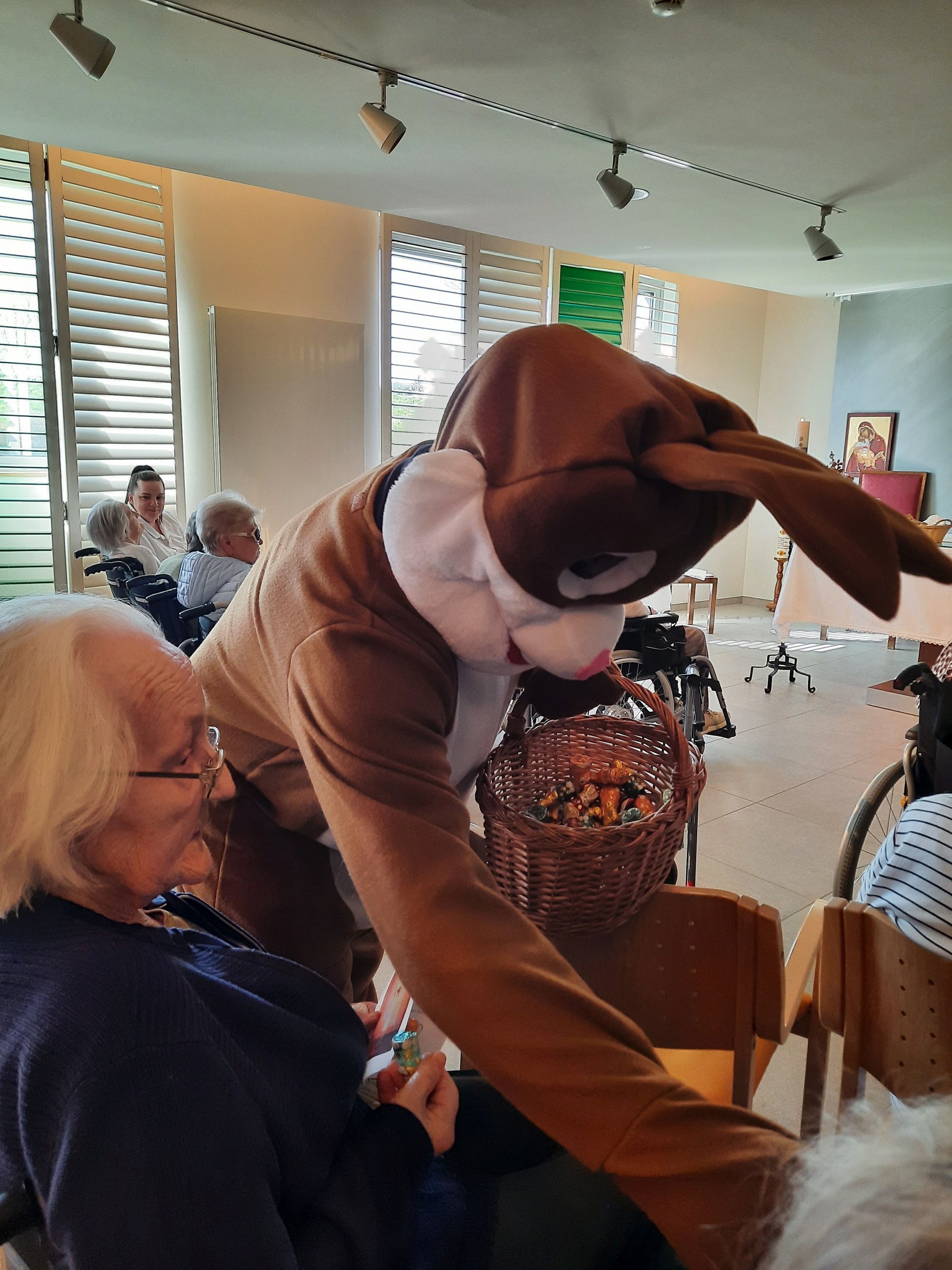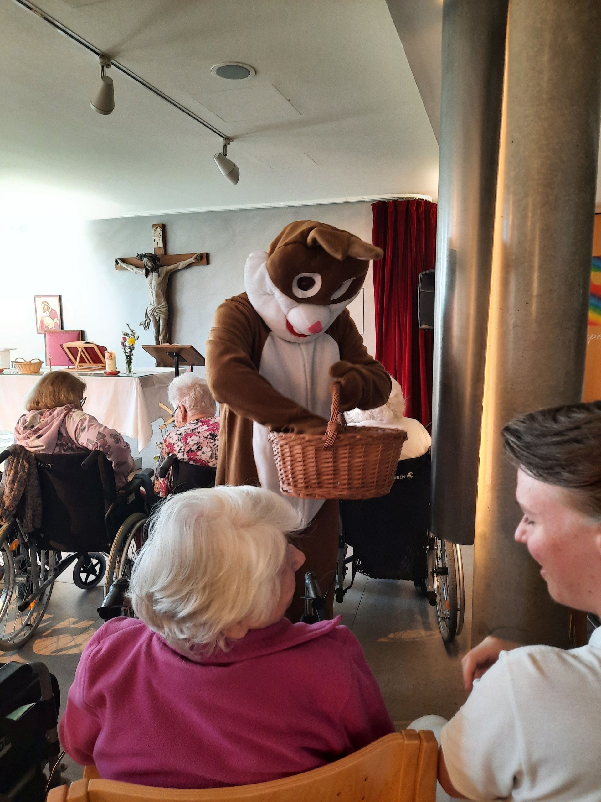 Am 07. April 2026 feierten wir gemeinsam die Ostermesse im Veranstaltungsbereich. Organisiert wurde die Messe von Seelsorgerin Mag. Stephanie Dorner gemeinsam mit ehrenamtlichen Kolleg*innen. Wir danken Priester Herrn DDr. Reinhard Knittel für die Abhaltung der Messe. Nach der Ostermesse besuchte der Osterhase unser Haus und verteilt Schokolade an alle Mitarbeiterinnen und Mitarbeiter sowie Bewohnerinnen und Bewohner. Danke lieber Osterhase für deinen Besuch. Am Nachmittag gab es für alle Bewohnerinnen als Osterjause eine Osterpinze mit Osterei aus der Küche.